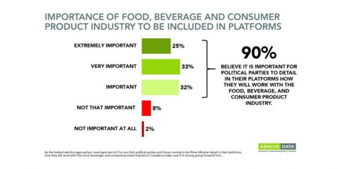 TORONTO, June 17, 2019 /CNW/ – Rising food prices worry nearly 9 in 10 Canadians ahead of the upcoming federal election, according to a major new opinion poll released today (Tuesday).  Fear of rising food prices is consistent across all regions, demographic groups, and political parties.