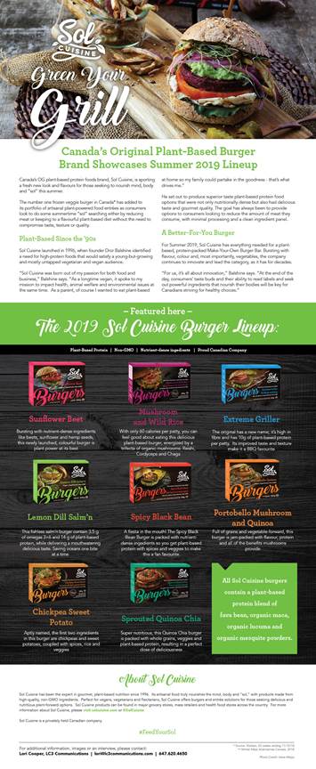 TORONTO, ON, June 24, 2019 – Sol Cuisine Inc., the number one frozen veggie burger brand in Canada*, has refreshed its look and added to its portfolio of artisanal plant-based protein foods for those looking to either reduce meat or keep to a flavourful diet all summer long without the need to compromise taste, texture or quality. (Click here to read full press release)
